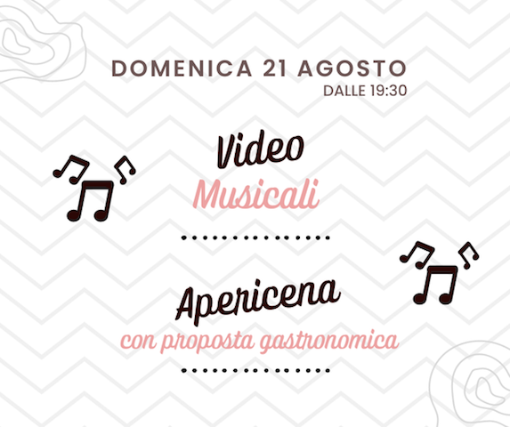 Domenica 21 Agosto dalle ore 19:30 sul nostro schermo in zona piscina una selezione dei migliori video musicali, il tutto accompagnato da gustoso apericena con proposta gastronomica.