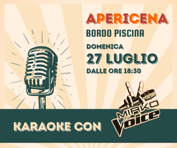 Vi aspettiamo dalle ore 18:30 con un ricco apericena bordo piscina e “Mirko The Voice” pronto a farvi cantare e divertire!