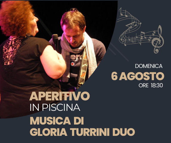 Domenica 6 Agosto l’aperitivo in piscina è accompagnato dalla musica di Gloria Turrini Duo. 🎶