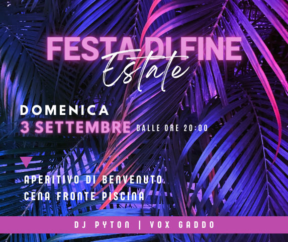 Aperitivo, cena fronte piscina e ad animare la serata Dj Pyton e il coinvolgente Gaddo che vi faranno cantare e ballare! 🎶