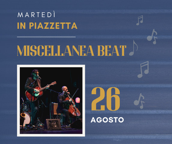 Vi aspettiamo martedì 26 Agosto dalle ore 20:30 per una deliziosa cena alla carta e dalle ore 21:30 musica live con “MISCELLANEA BEAT” – Gionata Costa (violoncellista e membro fondatore dei Quintorigo) e Massimo Marches (chitarrista e cantautore riminese).